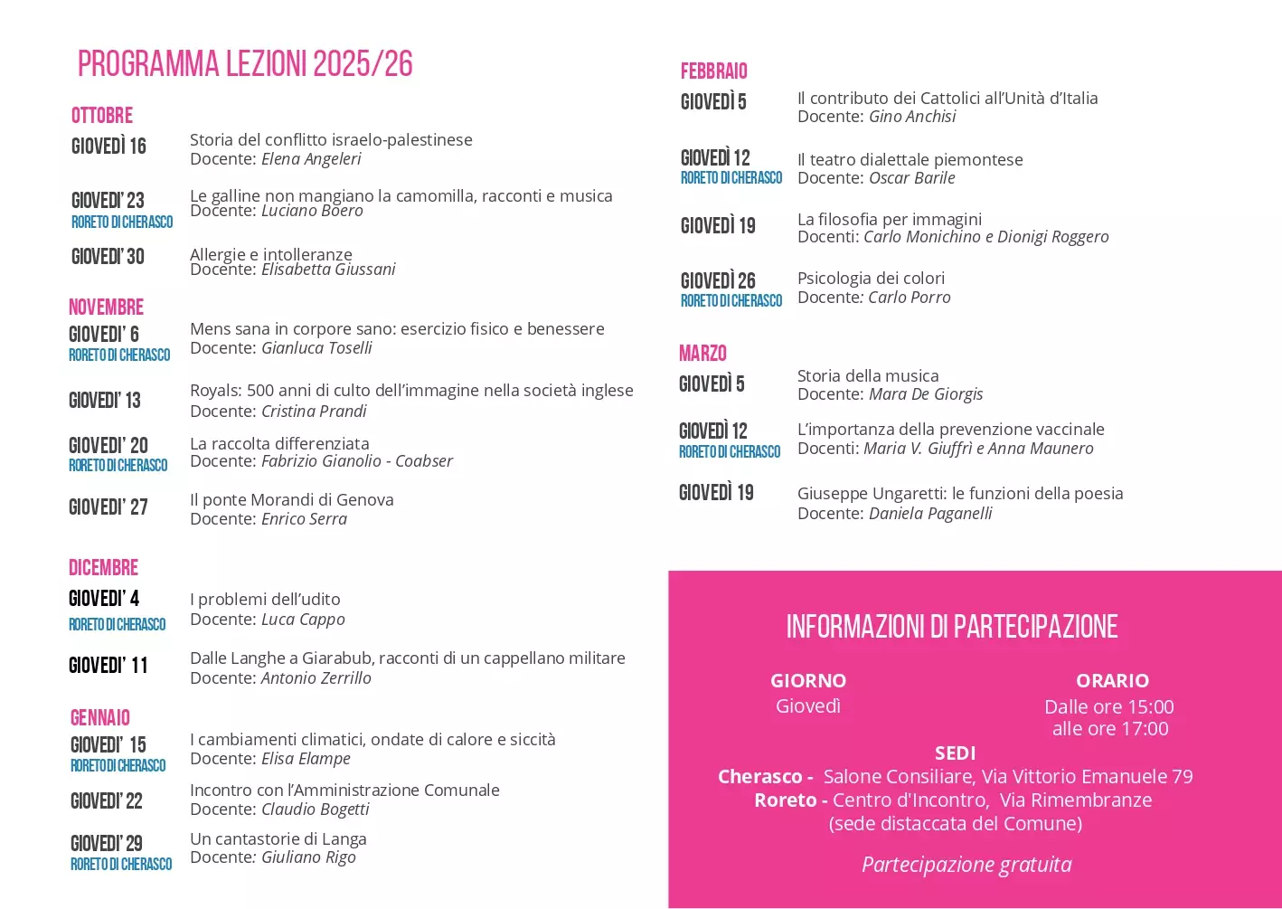 Le lezioni si svolgono a Cherasco Capoluogo presso il Salone Consigliare e a Roreto di Cherasco presso il Centro di Incontro, la partecipazione è gratuita.