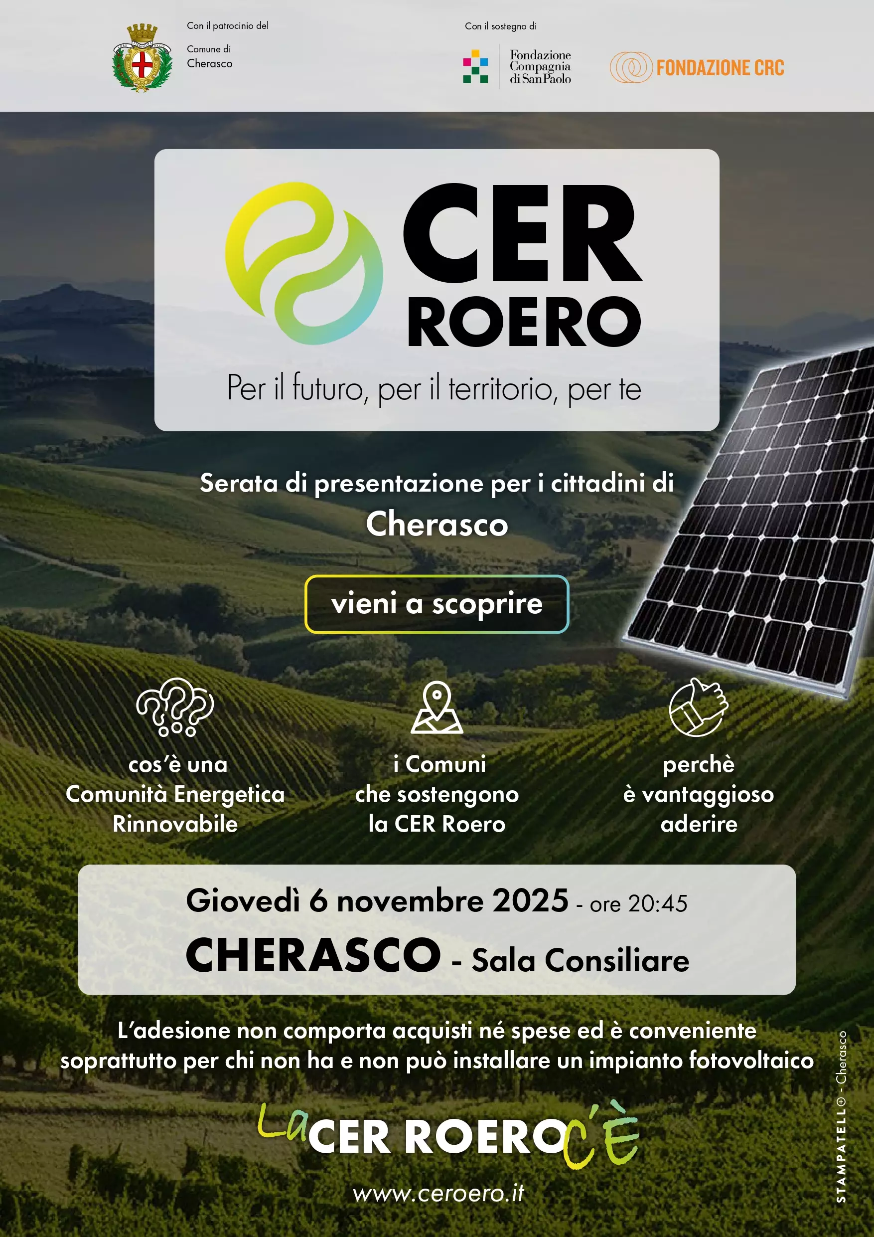 «Gli incontri organizzati a Roreto e Cherasco – dice l’assessore Alessandro Bollano - rappresentano un’importante occasione per informare in modo chiaro e trasparente i cittadini, le imprese e le realtà locali su come funziona il progetto della Comunità Energetica Rinnovabile. Sarà un momento utile per comprendere i benefici concreti, sia ambientali che economici, e per scoprire quanto sia semplice aderire, senza dover cambiare fornitore di energia né sostenere costi. Il nostro obiettivo è promuovere una partecipazione consapevole, perché la transizione energetica riguarda tutti e può partire anche da piccoli gesti condivisi. Partecipate numerosi».
